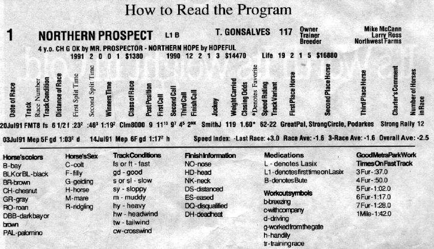 hints : ( right click to view & print) This "menu" below lists the acronyms so you can read the horses starting position, their final position when they crossed the line, their previous finishing times & the distance they raced, etc. Try to get a handle on their abbreviations before race day. |